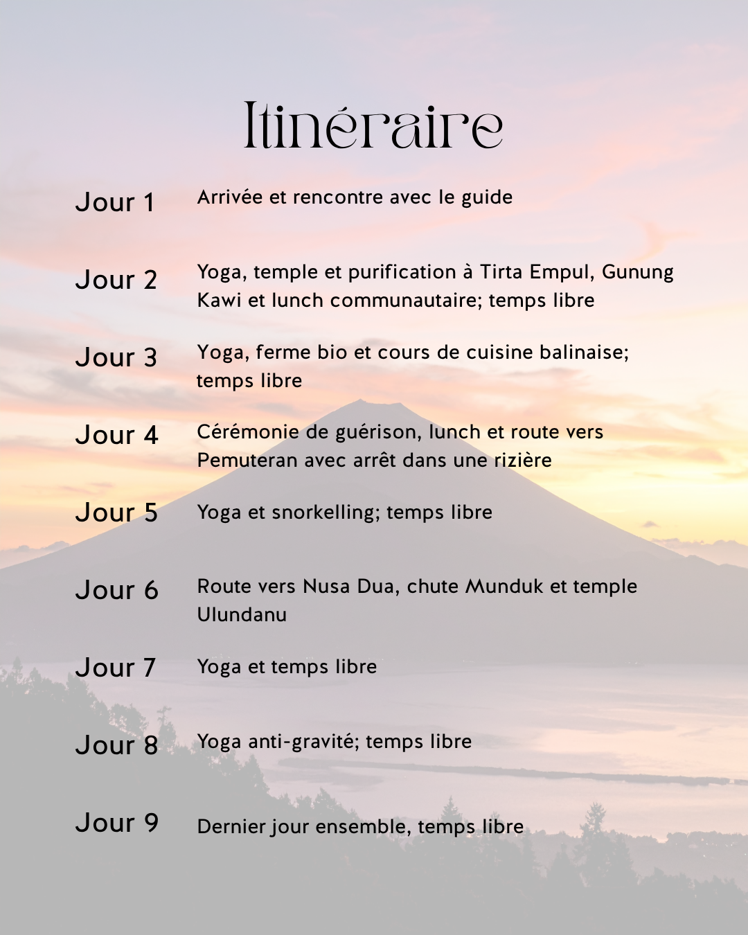 Inclusions : Transfert à l'arrivée, 4 à 5 cours de yoga, visite du temple Tirta Empul, cérémonie de guérison, visite du temple Gunung Kawi, plongée avec tuba à l'île Menjangan, randonnée à la cascade Munduk, visite du complexe du temple Ulun Danu, trekking dans les rizières en terrasses de Jatiluwih, rencontre avec un guérisseur traditionnel, tous les transports entre les destinations et vers/depuis les activités incluses.
